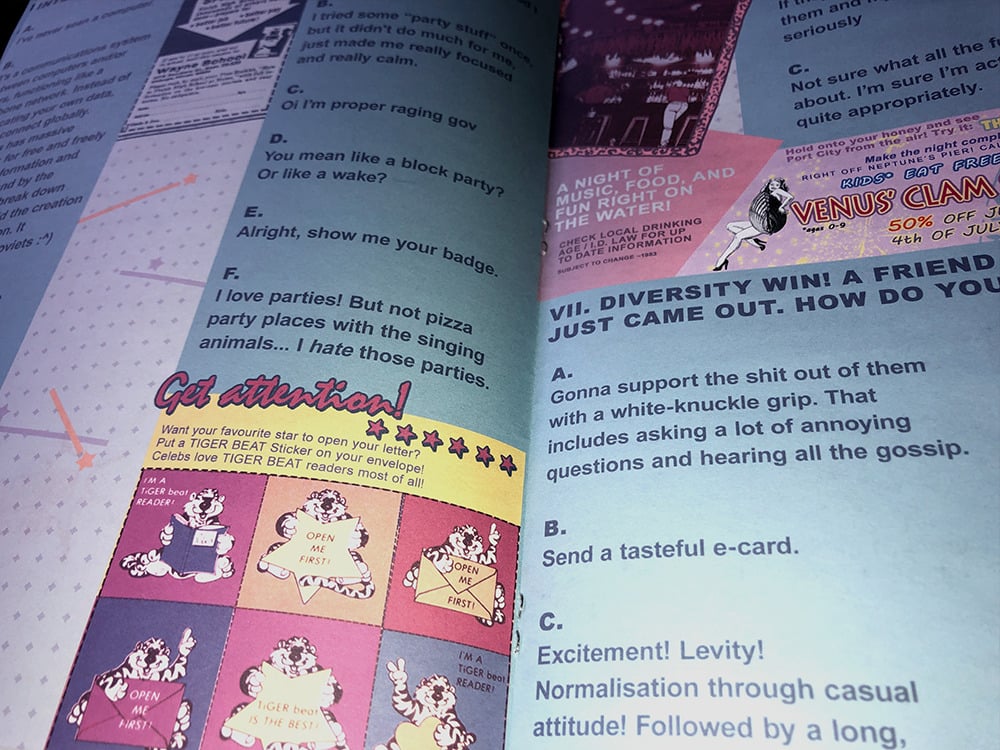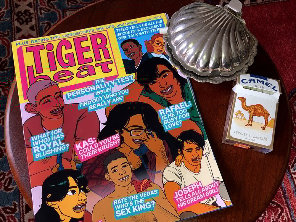 Full color, 6 page parody of Tiger Beat magazine. Features an 8 question quiz and a randomized 11 in. x 17 in. fold-out pin-up poster of Rafael, Kas, or Royal.