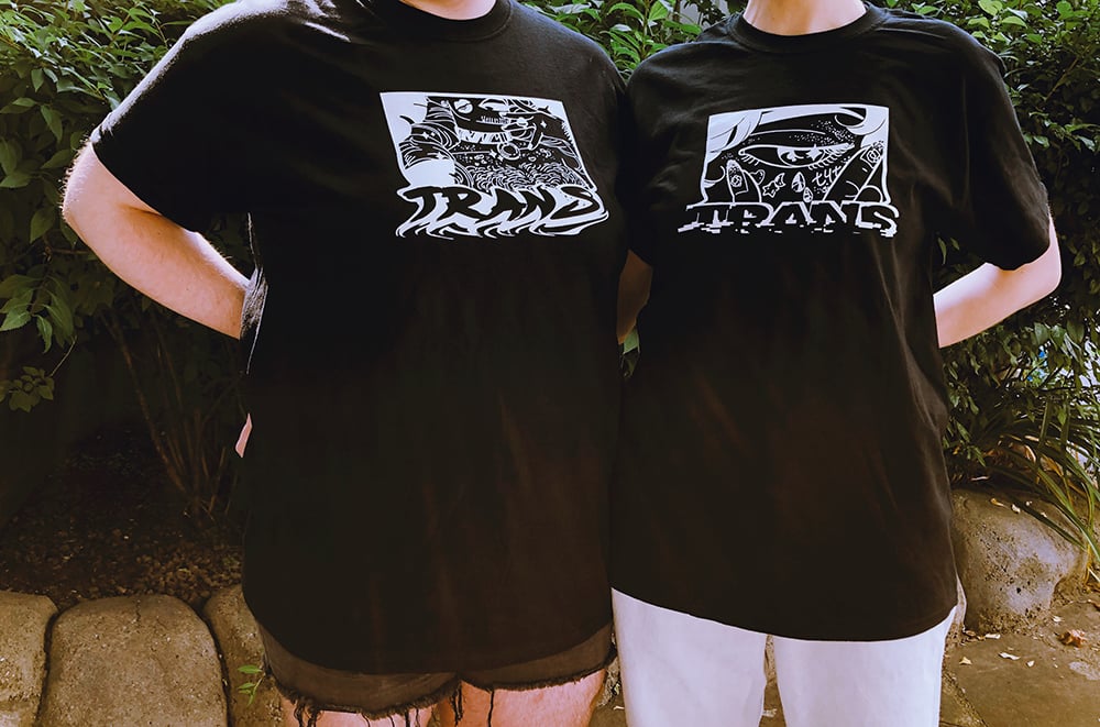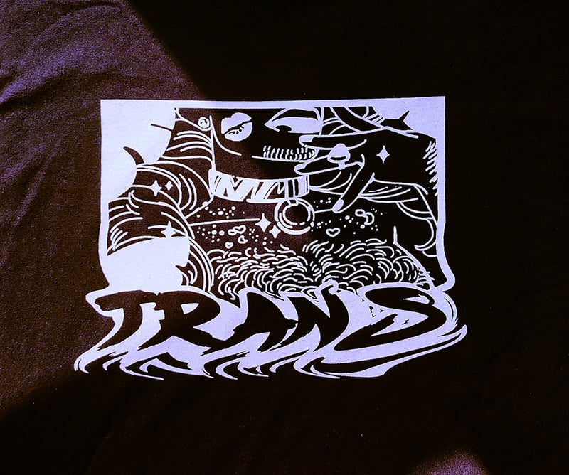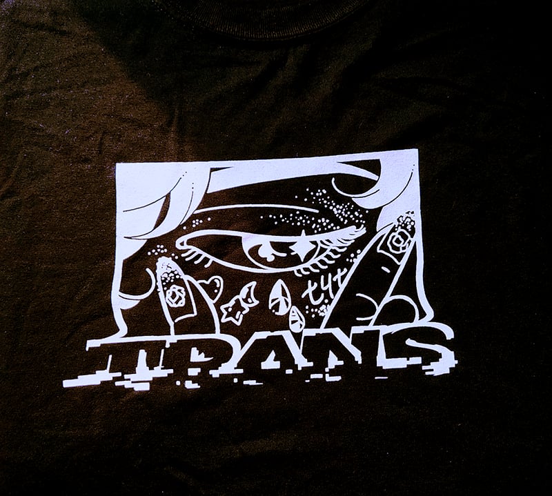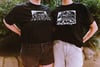 Screenprinted white ink on black 100% cotton t-shirt. Shirts hang nicely and have some stretch to them.